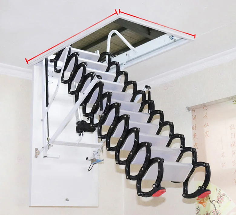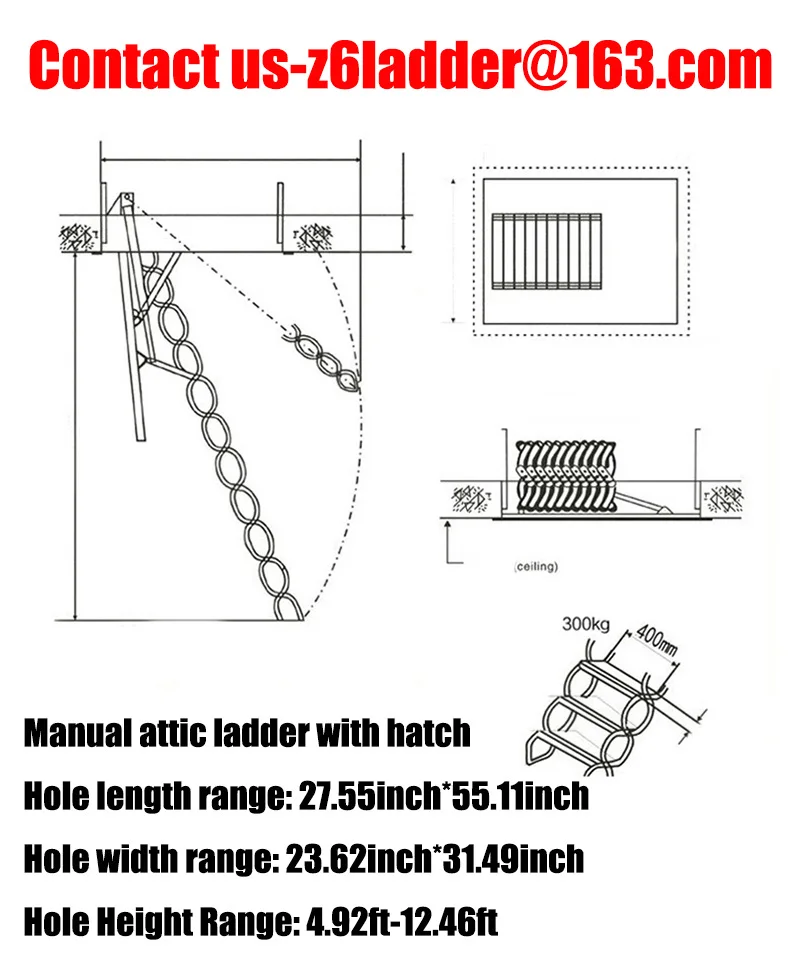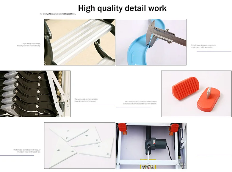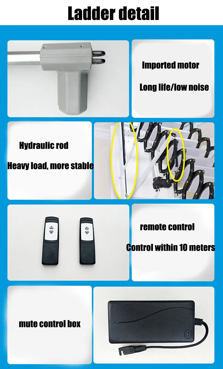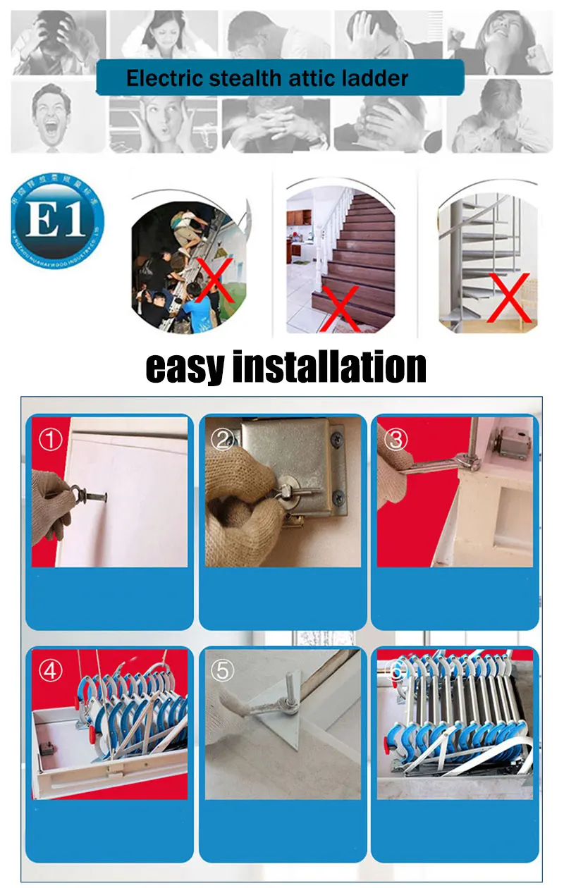 The electric attic ladder adopts an integrated design, the telescopic ladder and the fixed hatch on the top become a whole, we have fully assembled all the steps before delivery, so you only need to fix the stairs in the ceiling opening after receiving the goods, and It's ready to use after plugging in the power