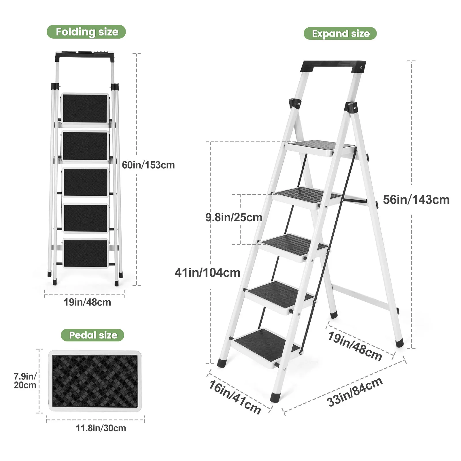 Safety Upgrade Folding 5 Step Ladder: powder coated heavy-duty steel for safety, rust resistance, long life sturdiness and reliability. With a net weight of only 11.8 lbs the steel ladder has a 300 lbs weight capacity.
