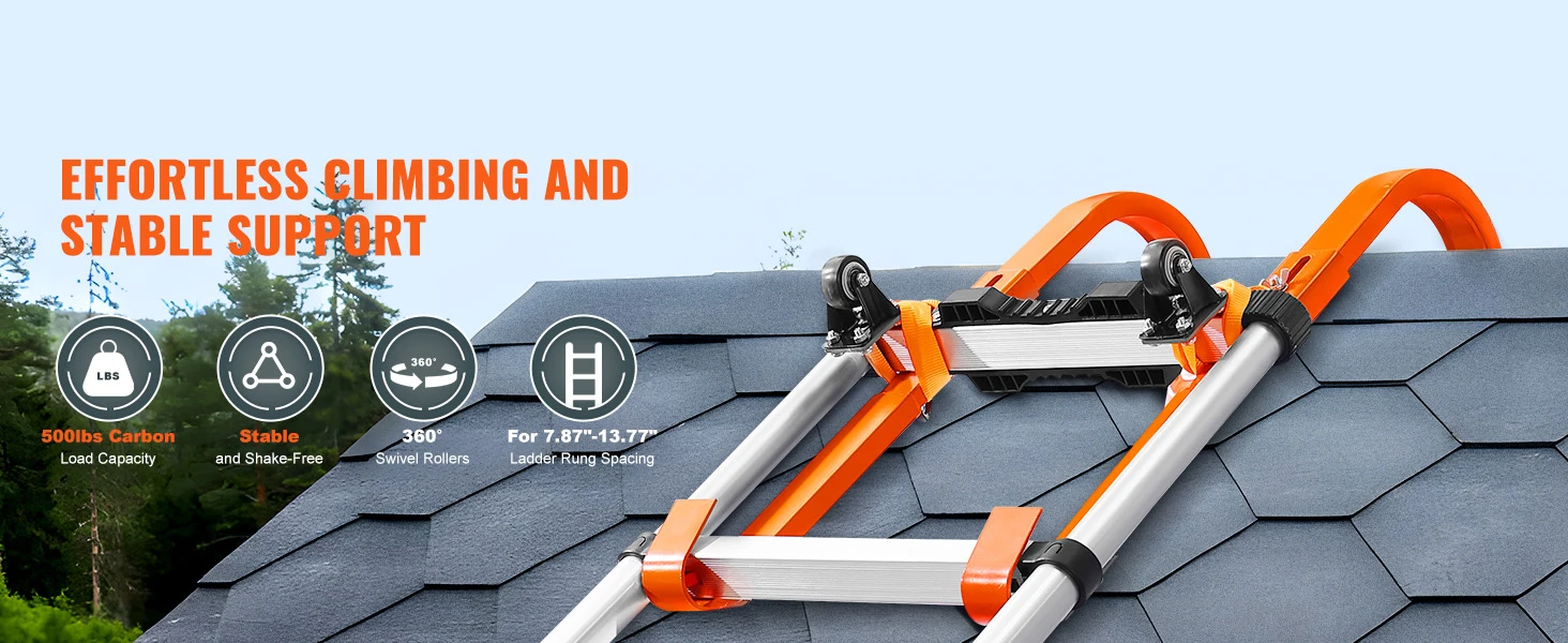 Swivel Wheels Included: Features 360° swivel wheels for easy maneuverability, reducing strain during ladder positioning on rooftops. Ensures a secure connection between ladder and roof for efficient and safe high-altitude tasks.